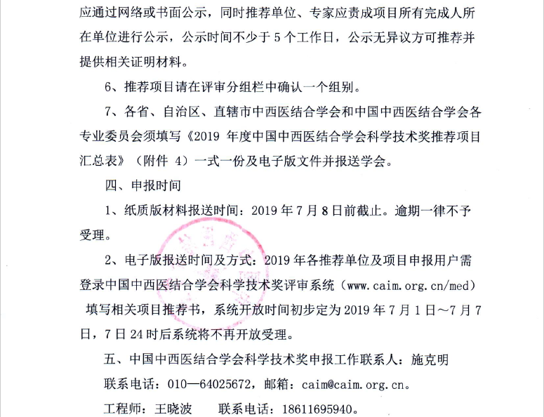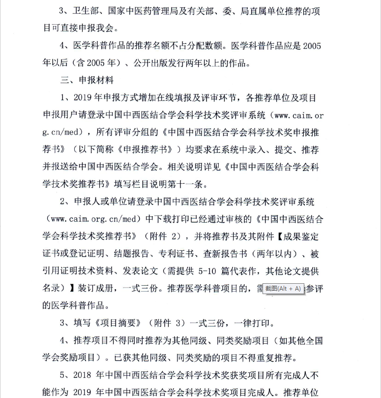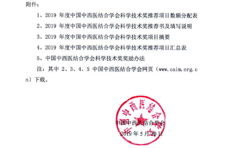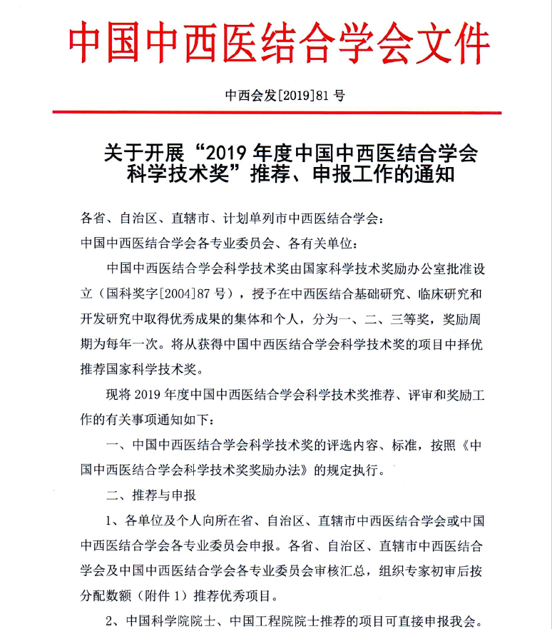 2019中国中西医结合学会科学技术奖推荐申报通知