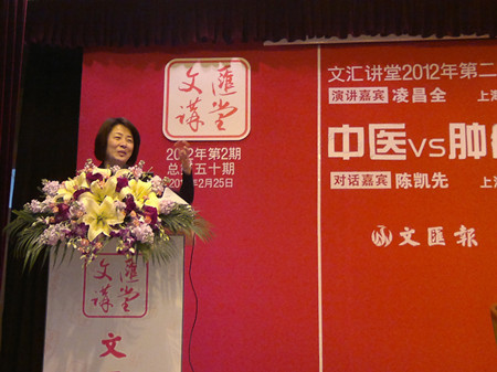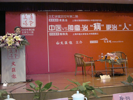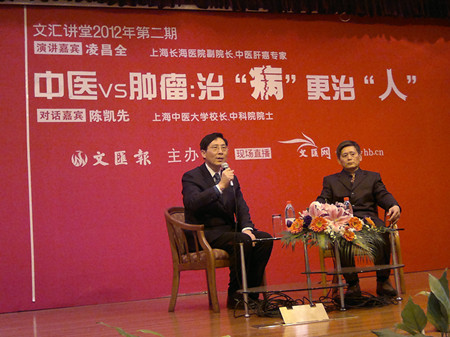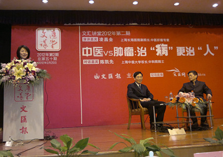 中科院院士、中国中西医结合学会会长、上海中医药大学校长、上海市科学技术协会主席陈凯先教授、中国中西医结合学会副会长、上海市中西医结合学会副会长、上海长海医院副院长、上海市名中医凌昌全教授于2012年 2月25日在上海文新大厦“文汇讲堂”2012年第二期,作《中医VS肿瘤:治病更治人》主题演讲与对话。