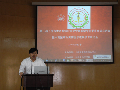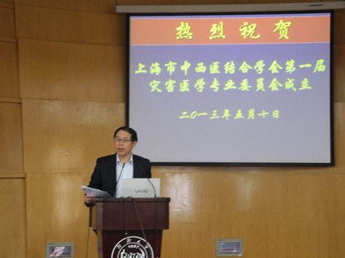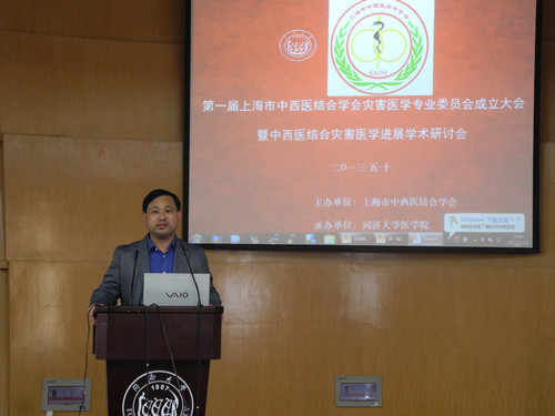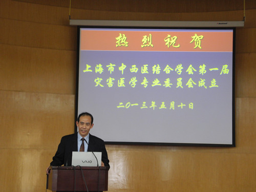 第一届上海市中西医结合学会灾害医学专业委员会成立大会暨中西医结合治疗灾害医学进展学术研讨会于2013年5月10日在同济大学医学院隆重召开。上海市卫生和计划生育委员会瞿介明副主任、中国中西医结合学会副会长、上海市中西医结合学会会长王文健教授、同济大学校长助理孙方霖教授、中国中西医结合学会灾害医学专业委员会主任委员岳茂兴教授、中华医学会灾难医学分会会长、上海东方医院院长刘中民教授、上海市中西医结合学会张友根秘书长等领导、专家出席会议。