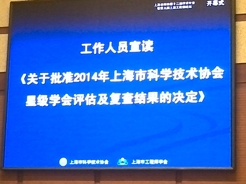 上海市科学技术协会第十二届学术年会暨第九届上海工程师论坛开幕式于2014年9月22日在上海市科协国际会议厅举行,上海市科学技术协会副主席高小玫主持会议,上海市科学技术协会主席陈凯先院士、上海市工程师学会理事长翁史烈院士大会致辞。开幕式上,上海市科学技术协会宣布2014年上海市科学技术协会星级学会,并向星级学会授予星级证书,上海市中西医结合学会荣获2014年上海市科学技术协会四星级学会。
