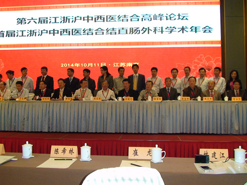 由江浙沪中西医结合学会共同主办的第六届江浙沪中西医结合高峰论坛暨首届江浙沪中西医结合直肠外科学术年会于2014年10月11日-12日在南京举行。本次会议由江浙沪中西医结合学会大肠肛门病专业委员会与南京中医药大学附属医院联合承办。来自江浙沪的中医、西医、中西医结合大肠肛门病的专家学者近400人出席会议。江浙沪中西医结合学会的会长、副会长、秘书长等出席会议,本次会议的主题:“新理念、新视野、新突破”。会议还举行会旗移交仪式,第七届江浙沪中西医结合高峰论坛将于2015年在浙江省举行。