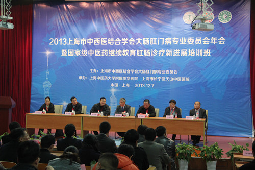 2013年12月7日由上海市中西医结合学会大肠肛门病专业委员主办,上海中医药大学附属龙华医院承办,上海市长宁区天山中医医院协办的“2013上海市中西医结合学会大肠肛门病专业委员会年会暨国家级中医药继续教育肛肠诊疗新进展培训班”在天山中医医院隆重举行,上海市中发办领导、上海市中西医结合学会秘书长、长宁区卫计委领导、天山中医医院领导出席会议并致辞对会议的召开表示祝贺。