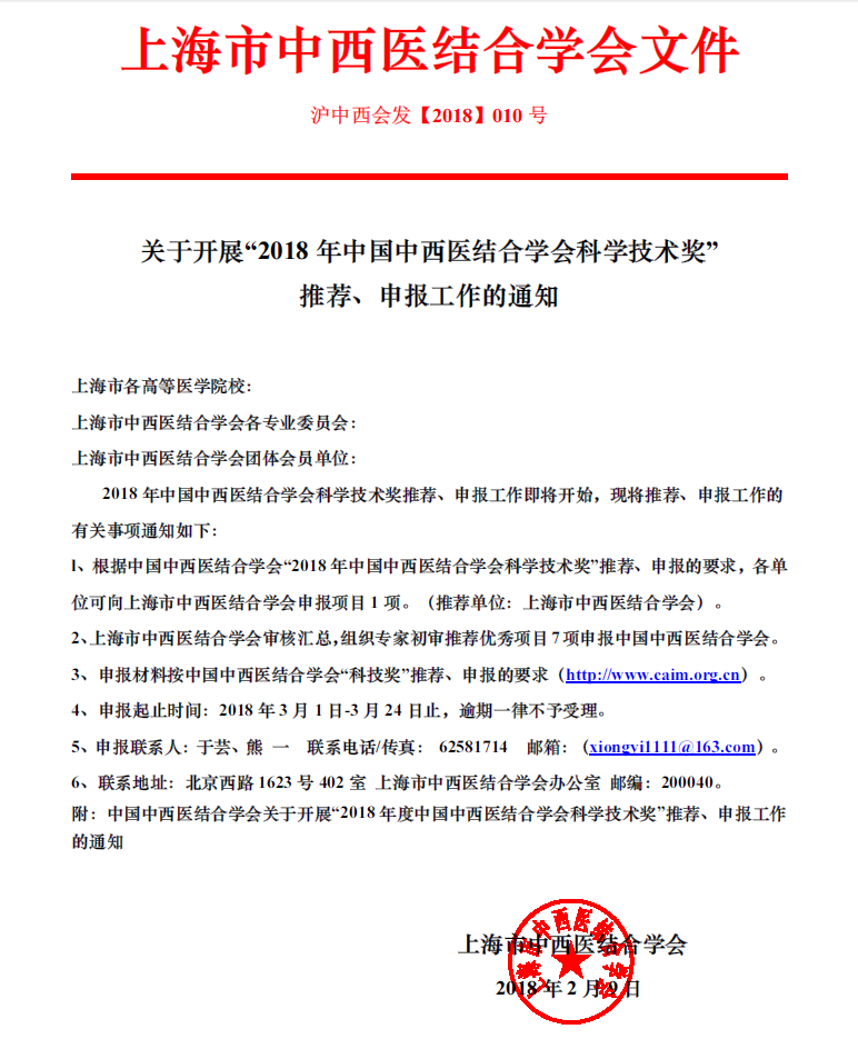转发自“2018中国中西医结合学会科学技术奖推荐、申报“通知