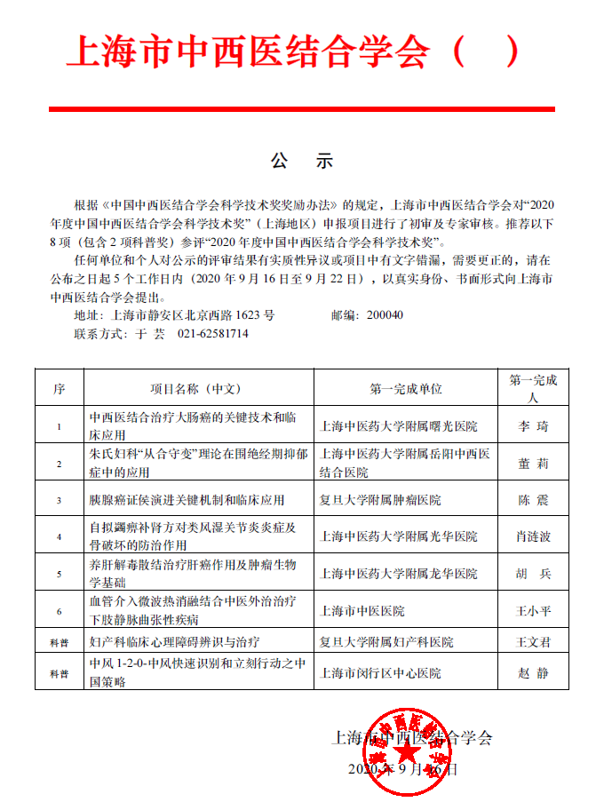 2020年中国中西医结合科技奖上海地区推送公示