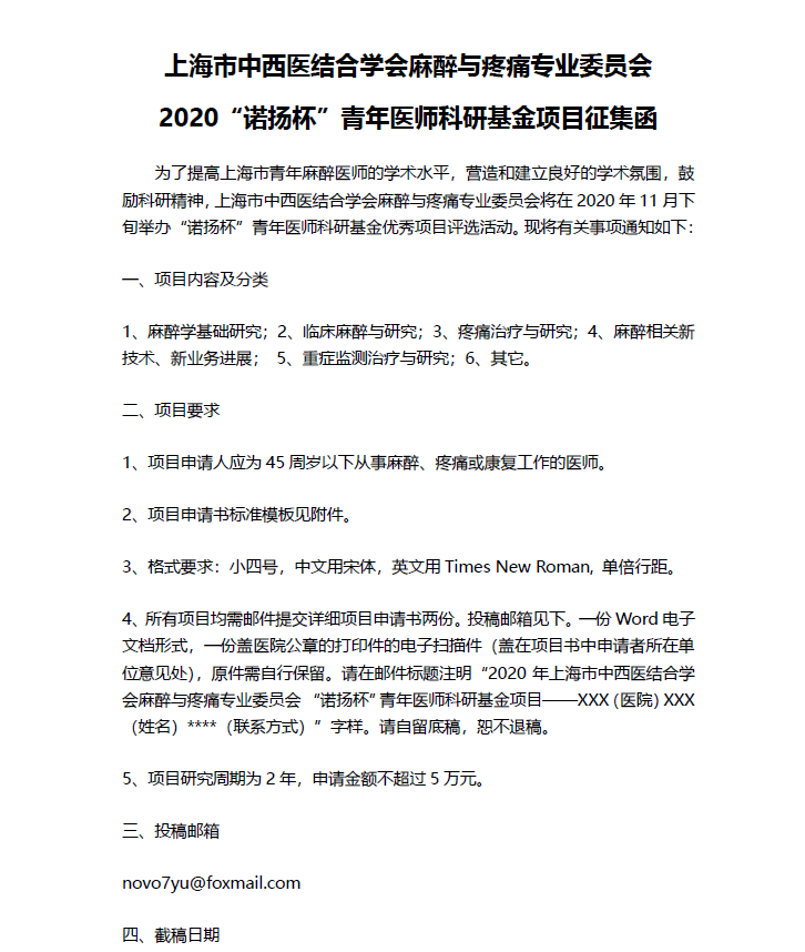 2020“诺扬杯”青年医师科研基金征集函