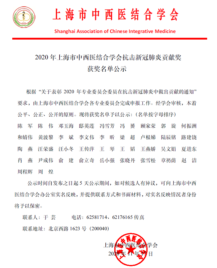 2020中西会抗击新冠肺炎贡献奖获奖名单