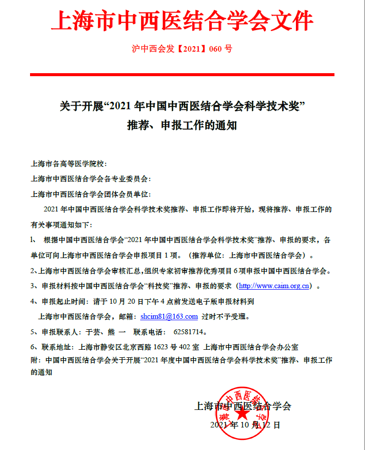 关于开展“2021年中国中西医结合学会科学技术奖” 推荐、申报工作的通知