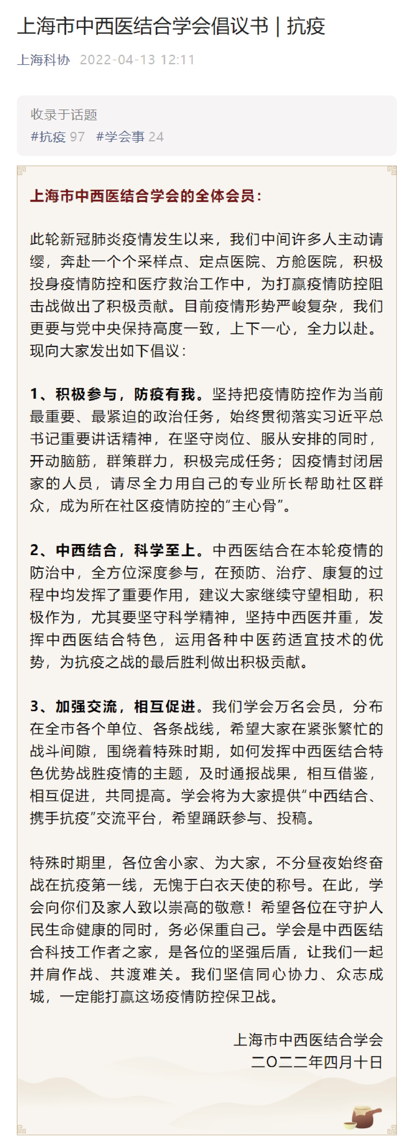上海市中西医结合学会倡议书 | 抗疫
