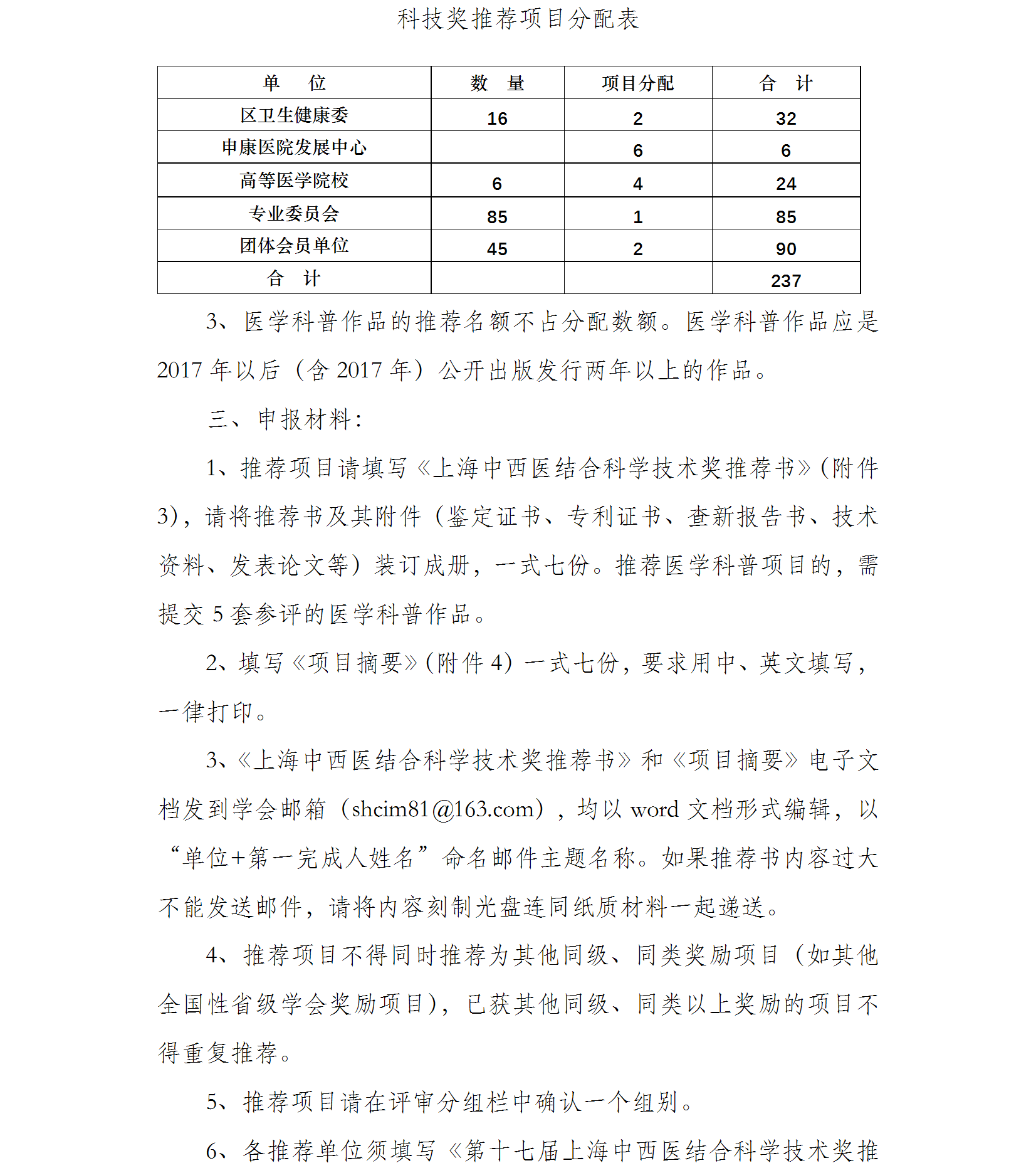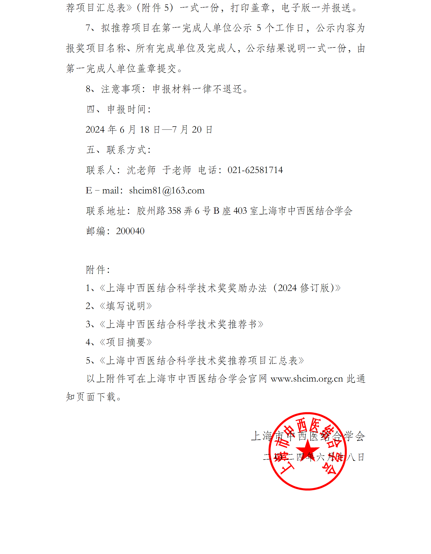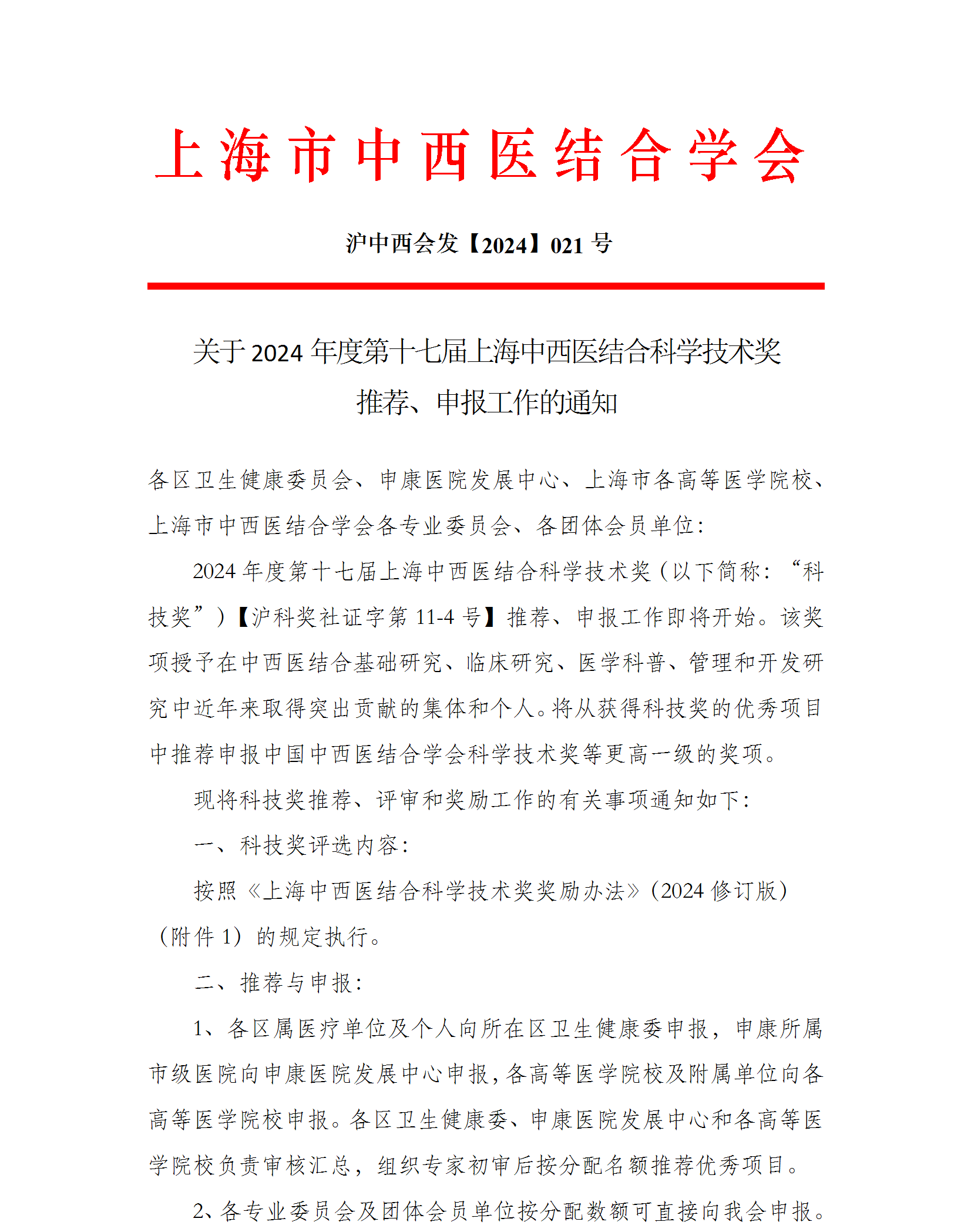 关于2024年度第十七届上海中西医结合科学技术奖推荐、申报工作的通知
