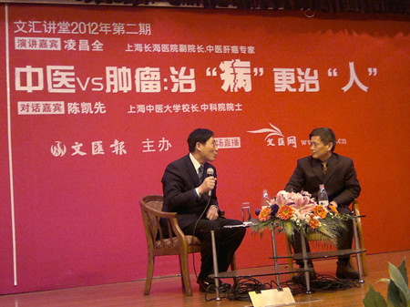 中科院院士、中国中西医结合学会会长、上海中医药大学校长、上海市科学技术协会主席陈凯先教授、中国中西医结合学会副会长、上海市中西医结合学会副会长、上海长海医院副院长、上海市名中医凌昌全教授于2012年 2月25日在上海文新大厦“文汇讲堂”2012年第二期,作《中医VS肿瘤:治病更治人》主题演讲与对话。