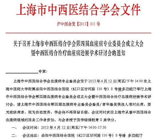 第四届血液病专业委员会成立大会通知