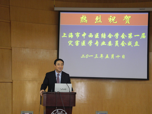 第一届上海市中西医结合学会灾害医学专业委员会成立大会暨中西医结合治疗灾害医学进展学术研讨会于2013年5月10日在同济大学医学院隆重召开。上海市卫生和计划生育委员会瞿介明副主任、中国中西医结合学会副会长、上海市中西医结合学会会长王文健教授、同济大学校长助理孙方霖教授、中国中西医结合学会灾害医学专业委员会主任委员岳茂兴教授、中华医学会灾难医学分会会长、上海东方医院院长刘中民教授、上海市中西医结合学会张友根秘书长等领导、专家出席会议。