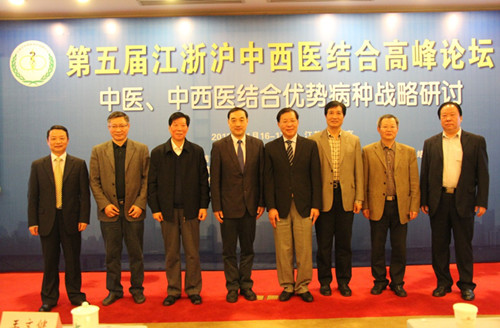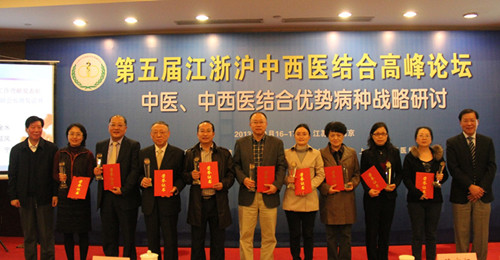 由江浙沪两省一市中西医结合学会联合举办的第五届江浙沪中西医结合论坛,于2013年11月16日在江苏省南京市隆重举行,本次论坛的主题为中医、中西医结合优势病种战略研讨,并表彰第二届江浙沪中西医结合学会优秀青年人才奖和学会工作贡献奖。中国中西医结合学会、江苏省卫生厅、江苏省中医药局以及两省一市中西医结合学会相关领导出席了论坛,来自江浙沪近200名专家学者代表出席会议。